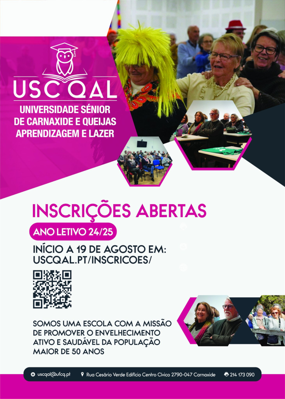 Hoje, dia 19 de agosto, abrem as inscrições para o ano letivo 2024-2025 da Universidade Sénior de Carnaxide e Queijas.