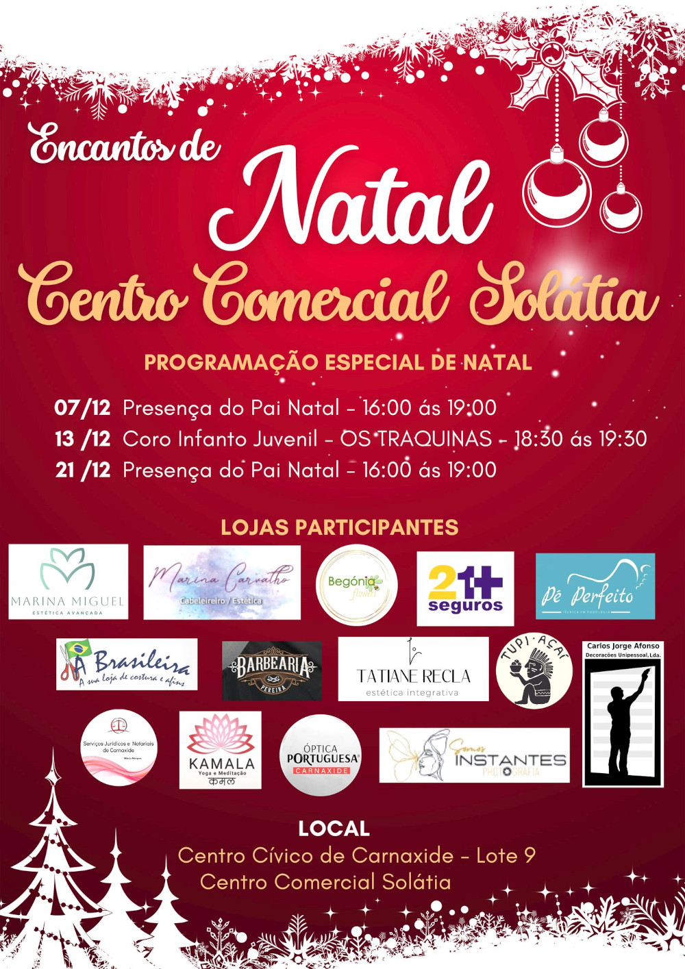 Nos dias 7, 13 e 21 de dezembro, o Centro Comercial Solátia, localizado no Centro Cívico de Carnaxide, apresenta uma programação especial de Natal.