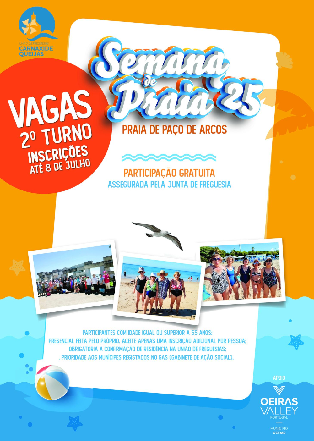 Estão disponíveis vagas para o 2º turno da Semana de Praia 2025 da União de Freguesias de Carnaxide e Queijas!