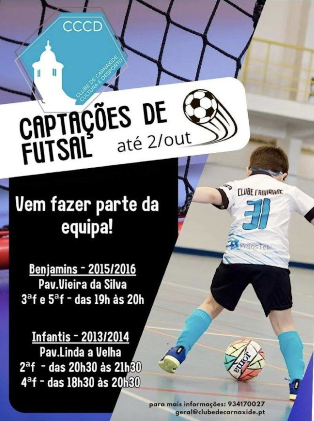 O CCCD - Clube de Carnaxide Cultura e Desporto realiza treinos de captação para atletas de futsal até 02 de outubro.