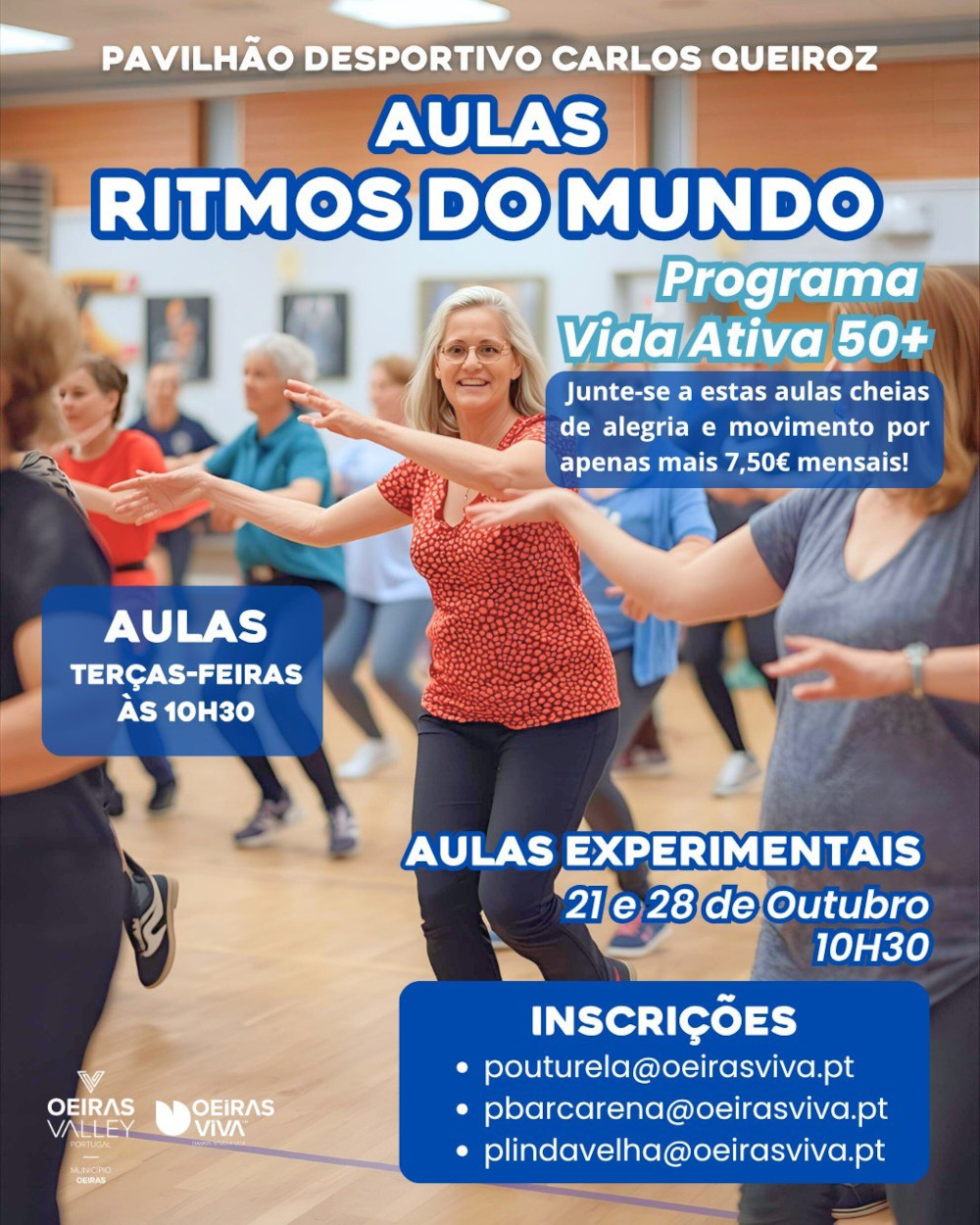 O Pavilhão Carlos Queiroz acolhe entre 21 e 28 de outubro aulas abertas de Ritmos do Mundo destinadas aos utentes do Programa Vida Ativa 50+.