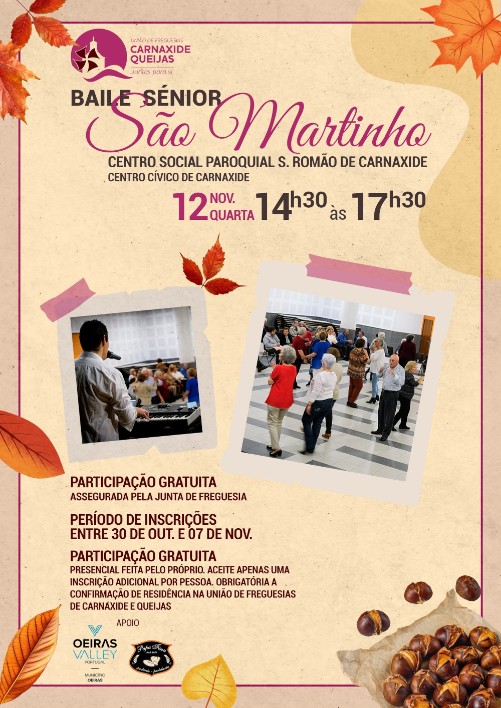 Vem aí mais um baile sénior promovido pela União de Freguesias de Carnaxide e Queijas. Desta vez vamos celebrar o São Martinho!